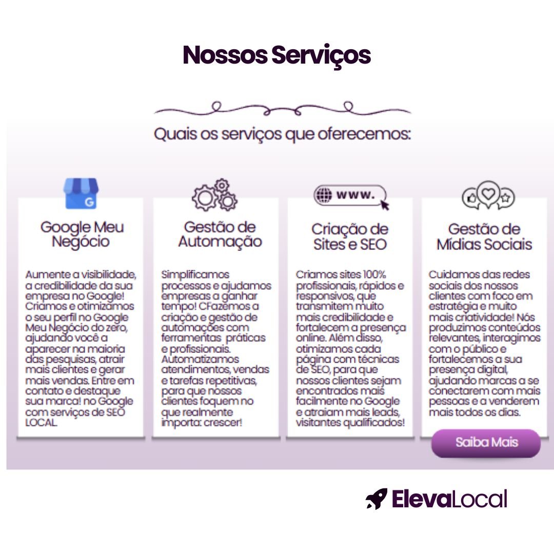Nós da Elevalocal, somos agência marketing digital, design gráfico, desenvolvimento web e automação, atuando em São Paulo e Brasil. Meu propósito é impulsionar sua empresa (empresas), oferecendo soluções aumentar a performance de negócios online. Com expertise profunda, crio estratégias que entregam resultados concretos, otimizando seus processos e expandindo sua presença digital. Trabalhamos para garantir seu crescimento. Ajudamos os nossos clientes, lojas virtuais e locais com todo acompanhamento. Conheça minhas soluções e eleve seu negócio. Entre em contato para uma consultoria. Ajudamos Negócios Locais com a Gestão de Redes Sociais e Google Negócio, SEO gestão, Criação Sites e Automação, landing Pages. Fazemos Consultoria marketing.